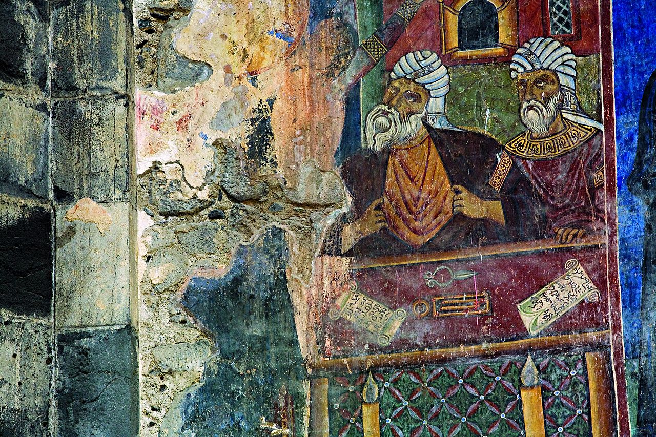 The murals are one of the best representations of Byzantine art outside the traditional borders of Byzantium. The majority of the murals bear scriptures in Greek. The murals were painted under the patronage of atabek Ivane Zakarian between 1205 and 1216. Parallels have been drawn between the murals and the 11th century Armenian miniature paintings of the Mugni Gospels.[4] The coloring of the murals is characteristic of typical Byzantine art while the thematic solutions are more Armenian. New and Old Testaments scenes as well as various saints including Saint Gregory the Illuminator are depicted on the murals.[3] A large image of the Holy Virgin is depicted in the dome holding Jesus. The mural has been badly damaged and only parts of it survived. Below the Holy Virgin, the Communion is shown where Jesus is depicted twice, turning on the right and left sharing bread with the Apostles.[14] The images of the Apostles Peter, John the Evangelist, Paul and Matthew have survived. The common Christians saints are depicted below the Communion scene, including Pope Sylvester, Saint James the son of Alpheus, Saint John Chrysostom, Basil the Great, Gregory the Illuminator, Jacob of Mtsbin, Clement of Rome, Gregory the Thaumaturgist, Cyril of Alexandria and Eusebius of Caesarea. The murals on the western wall depict the Kingdom of Heaven. The northern wall depicts the trial of Jesus by the high priest of Caiaphas and by the Roman Procurator Pontius Pilate. Some of the murals were renovated in 1979. The arches, niches and columns are also covered by murals.[14]
