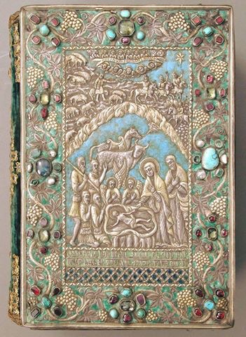 These jeweled, enameled, and gilt-silver repoussé covers for a 13th century Armenian gospel are examples of the work produced in the late seventeenth-century silversmith workshop of Kayseri. Both front and back covers are signed, informing us that they were made in Kayseri in 1691 by Astuatsatur Shahamir. The central image on the front cover depicts the Adoration of the Shepherds, and above, the magi following the star. Amid angels, banner in the sky proclaims, “Glory to God in the highest and on Earth peace.” The same composition of shepherds appears on two sets of gospel covers made in Kayseri by M. Karapet Malkhas, one dated 1671 (Mekhitarist Library, Vienna, MS 416) and the other dated 1691 (present location unknown). On the back is the Resurrection, showing Christ in a mandorla holding a bannered cross, surrounded by baroque cherubs and clouds. The green velvet spine is decorated with six garnets and numerous crystal gems arranged in a diamond pattern. These silver covers were attached to a gospel copied and illuminated by a thirteenth-century scribe named Grigor, from Cilicia.