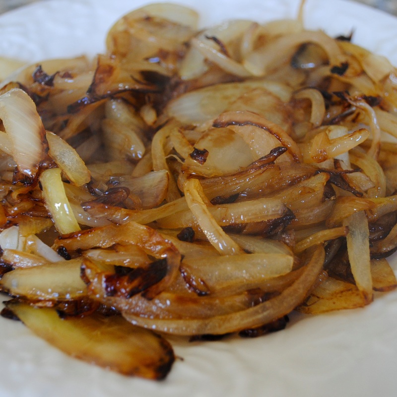 - Garnish with caramelized onion strips (we mix the onions in before eating)