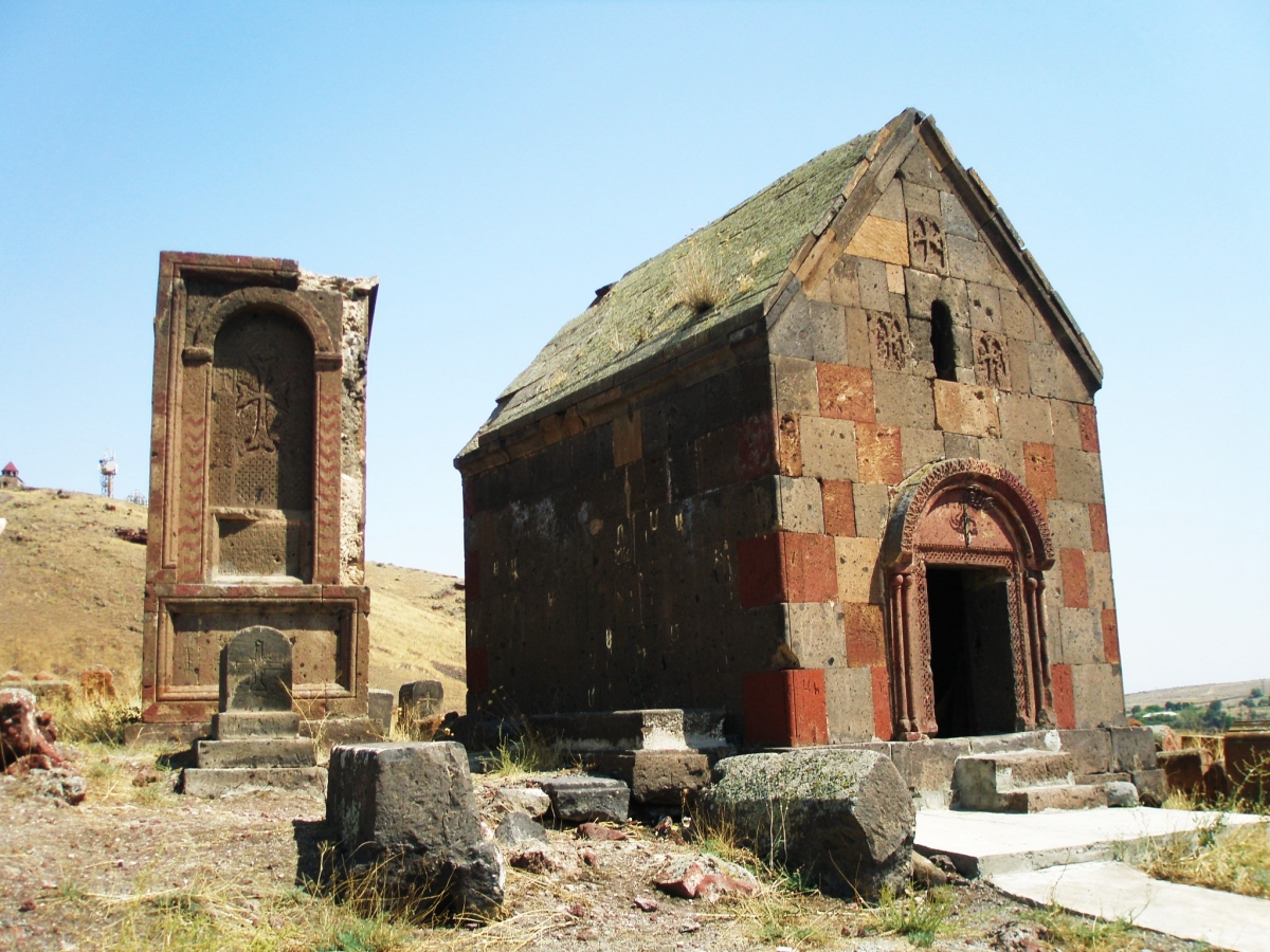 Tukh Manuk shrine with the large khachkar adjacent. In the background the Shrine of Surb Grigor may also be seen